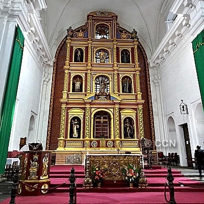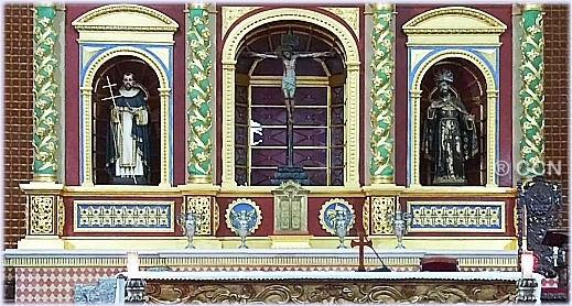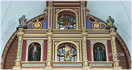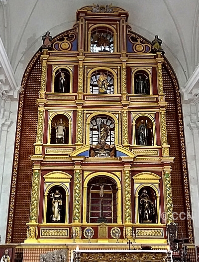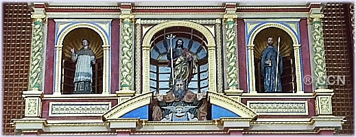y cinco cuerpos con nichos ocupados por imágenes de santos