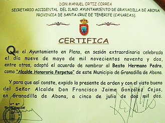 inscripción Canonización del Hermano Pedro; y,